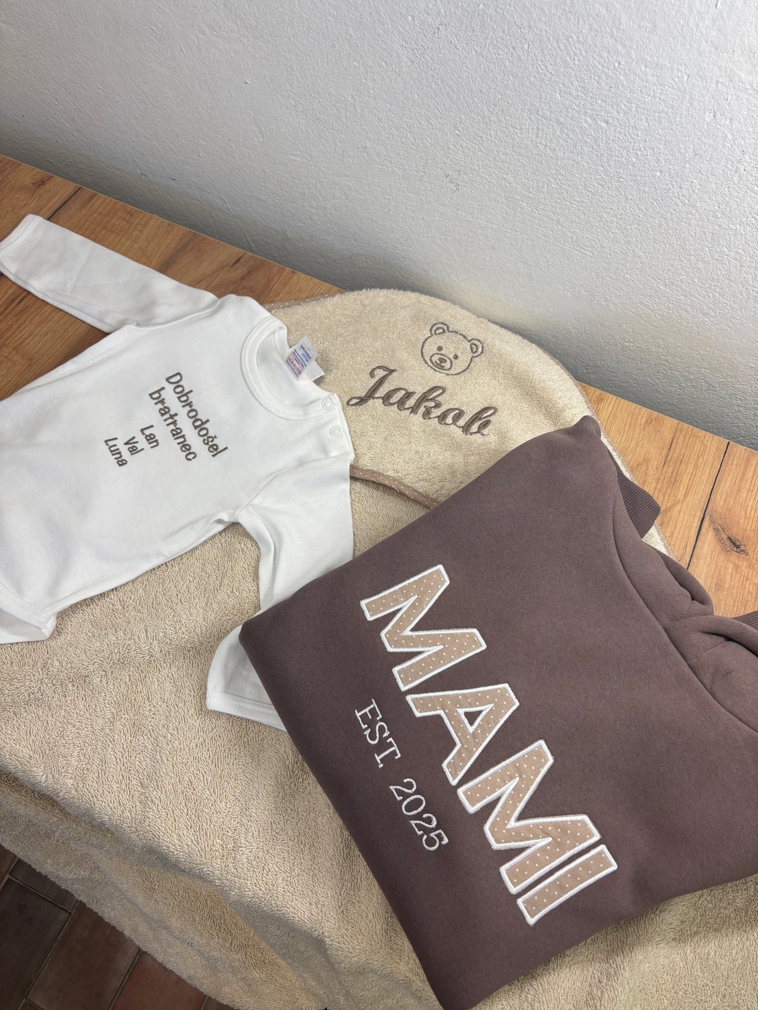 Stranka nam je zaupala svoje želje, mi pa smo z veseljem ustvarili personaliziran body in brisačko za novega družinskega člana ter hoodie za ponosno mamico.