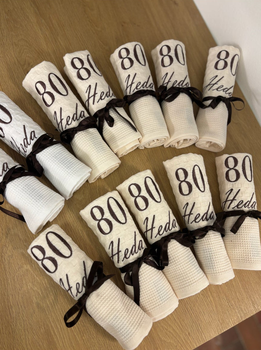 Vezenje jubilejne številke in imena na serviete